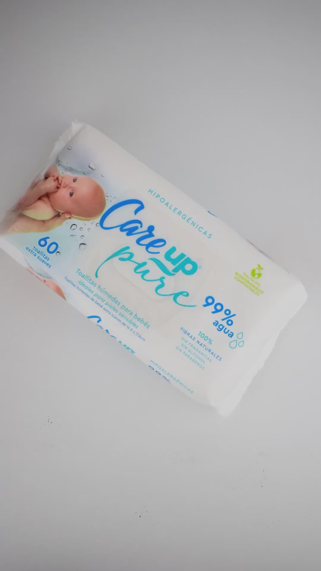 Toallitas húmedas de bebé con la fórmula más pura de 99% agua. Su fórmula hipoalergénica con pH balanceado y libre de alcohol ha sido dermatológicamente testeado asegurando un seguro cuidado de tu bebé. Toallitas biodegradables y compostables debido a que son 100% de fibras naturales, lo que además las hace extra suaves. Ideales para pieles sensibles.
