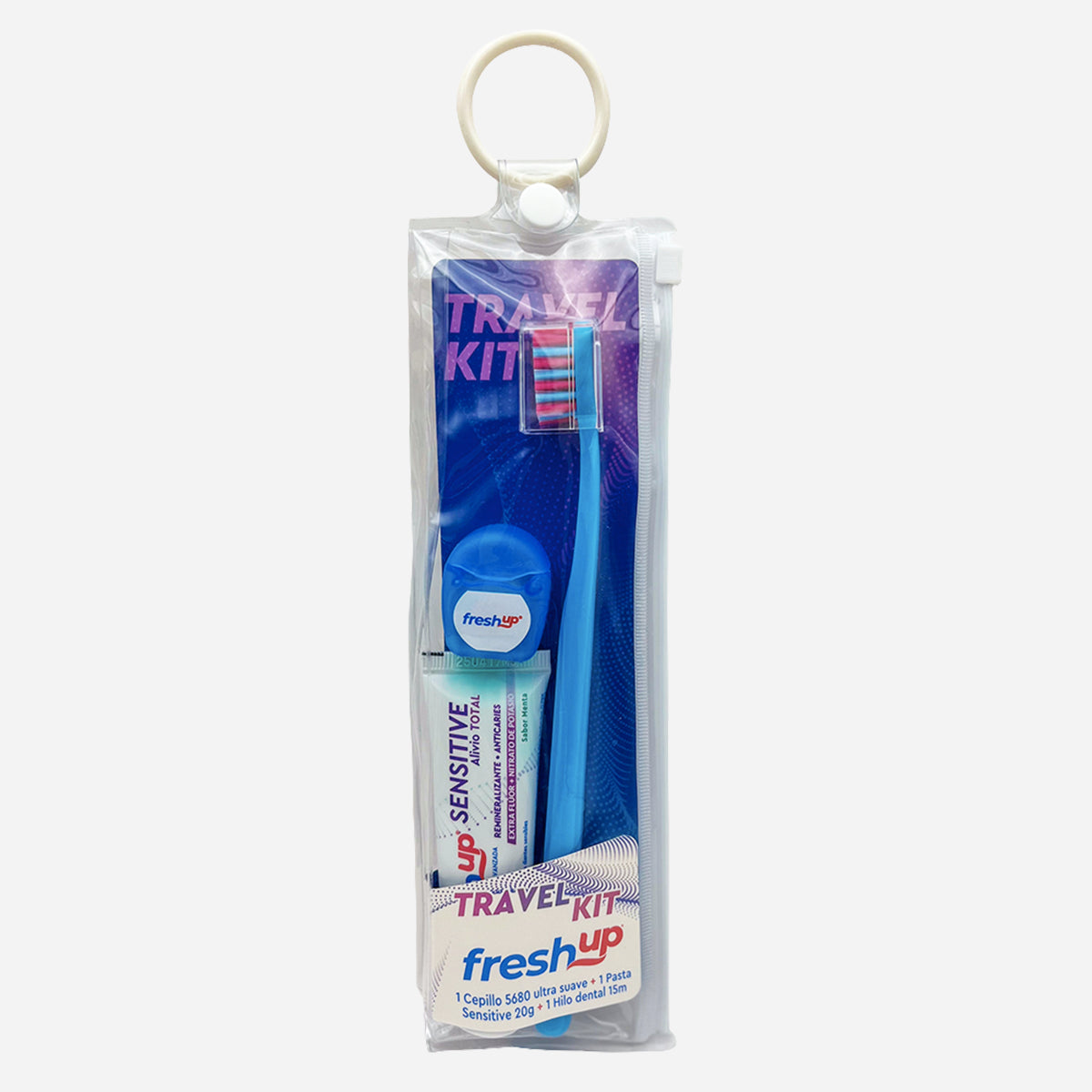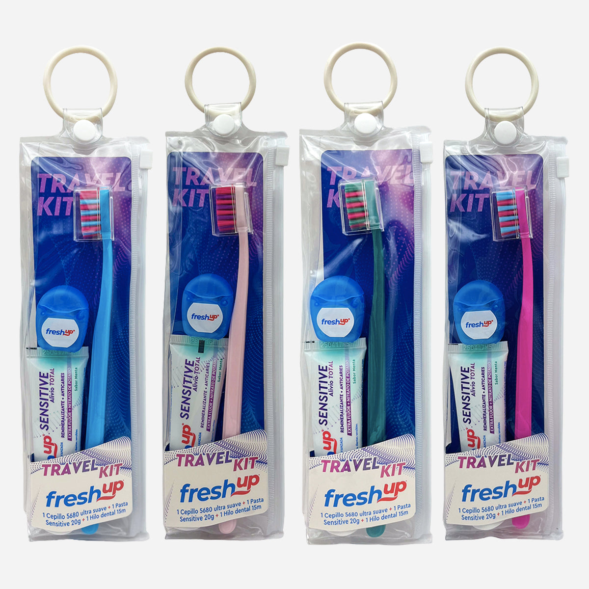 Nuestro Travel Kit Fresh Up® ofrece una solución completa y práctica para tu higiene bucal diaria, estés donde estés.